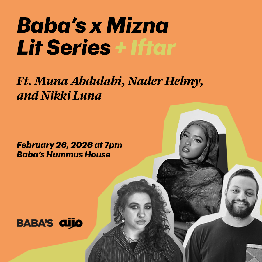 Baba’s and Mizna co-present the first 2026 reading of their quarterly series featuring the Mizna Writing Collective and their invited guests. This time, we’ll hear from Muna Abdulahi, Nader Helmy, and Nikki Luna.