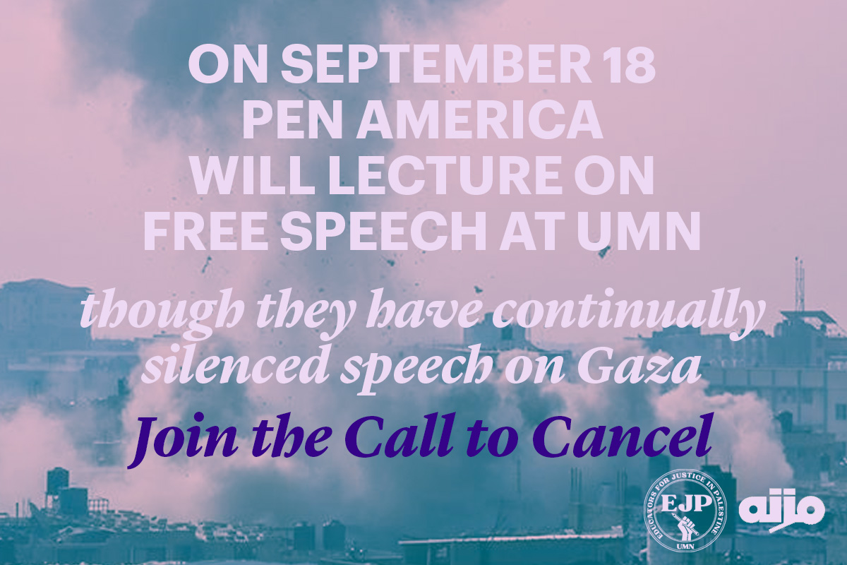 On September 18, 2025, the University of Minnesota’s Office of the Vice Provost and the Senate Faculty Consultative Committee will host PEN America to lead a symposium called A Campus for All: Campus Free Speech, Academic Freedom, and the Current Challenges to Higher Education. The decision to hold such a forum led by PEN America, which has a long track record of suppressing Palestinian voices and critiques of the state of Israel, is hypocritical. It disregards the coalitional pressure campaign led by Writers Against the War on Gaza to hold PEN American accountable for its actions, which include failing to meaningfully address Israel’s genocide on Gaza, normalizing Israel’s colonization of Palestine, suppressing Palestinian voices, promoting Islamophobia, and clamping down on the free speech of its own staff members. Thanks to the campaign, the organization has suffered damage recently, with its major Jean Stein award having to be canceled two years in a row because the nominated authors have withdrawn their books from consideration. The university’s invitation of PEN America while it bypasses the many qualified experts on free speech, academic freedom signals that the university is not actually interested in protecting free speech on campus.